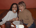 JoAnn Mangione JoAnn and I grew up not too far from each other on Long Island me in Levittown, her in East Meadow but we never knew each other there. We met in Lakewood, OH, in the early '90s, when I was living in the upstairs half of a double on Athens and she was moving to town from Syracuse to work at Channel 3 TV. She looked at an apartment in the double next door to mine, didn't rent it, but became friendly with the house's owner, Julie who lived upstairs and was thus my next-door neighbor. Julie eventually moved away and dropped out of sight, but JoAnn and I have been friends ever since. (We never dated, but people who saw us together often assumed that we were a couple and, when they found out that we weren't, often wondered why we weren't. Eeeeeeuw, we'd say. We definitely spent a lot of time commiserating with each other about our messed-up love lives, though....) After a couple of years at Channel 3, Jo left television and took a job as public relations manager at the Cleveland Play House, America's first professional theater. (I got to see a lot of really excellent theater as her guest thanks, Jo!) She introduced me to her old friends Susan and Bill when they moved to Cleveland, and the four of us have spent a ton of very enjoyable time together. Meanwhile, JoJo has always had a hankerin' to live in the Washington, DC, area, and in 2001 she packed up and moved there. She found a job doing PR for a think tank called the Constitution Project, got a pretty little apartment in Old Town, Alexandria, VA, made some nice new friends. The CP unfortunately suffered some budget cutbacks and had to let her go, but she ultimately got a PR job in Bethesda, bought her first home, and fulfilled another lifelong dream by beginning to take acting classes. The top photo was taken in downtown DC in 2002. The dog is Fala, and the site is the FDR Memorial. The two little ones at the left, also from 2002, are of my then-girlfriend Michelle and Jo in Alexandria eating S'moreos at Cosi and of Becca and JoJo at my place in Strongsville, OH, when Jo was in town for Thanksgiving. Return to Friends. |