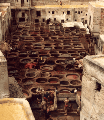 Casablanca, to my surprise and disappointment, was drab and boring. Rabat, the capital, was more interesting, and Marrakesh was absolutely fascinating. My favorite place, though, was Fez when you're there, you're not only in a foreign country, you're in another century. The photo at the left shows the leather-tanners' souk, where young boys dunk untanned hides into dye-filled pits and stand on them until the color has enough time to do its work. The smell is unbelievable and unforgettable BYO clothespin for your nose.