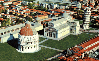 The photo at left is one of the few on this website I didn't take myself. It's a postcard I bought, showing the Piazza dei Miracoli, the Plaza of Miracles. At the right is the Leaning Tower, which I climbed a half a dozen times in the '70s but which was closed, alas, for repairs in 2001. The big building in the center is the Duomo, or catherdral, and the red-roofed circular building at the left is my favorite, the Baptistry.