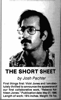 Soon after, Bob and Ed told me that they were going to cut me back from about a page and a half per issue to less than a page. At that point, I decided to take "The Short Sheet" out of Mystery Scene and turn it into an independent publication, which debuted in April 1987.