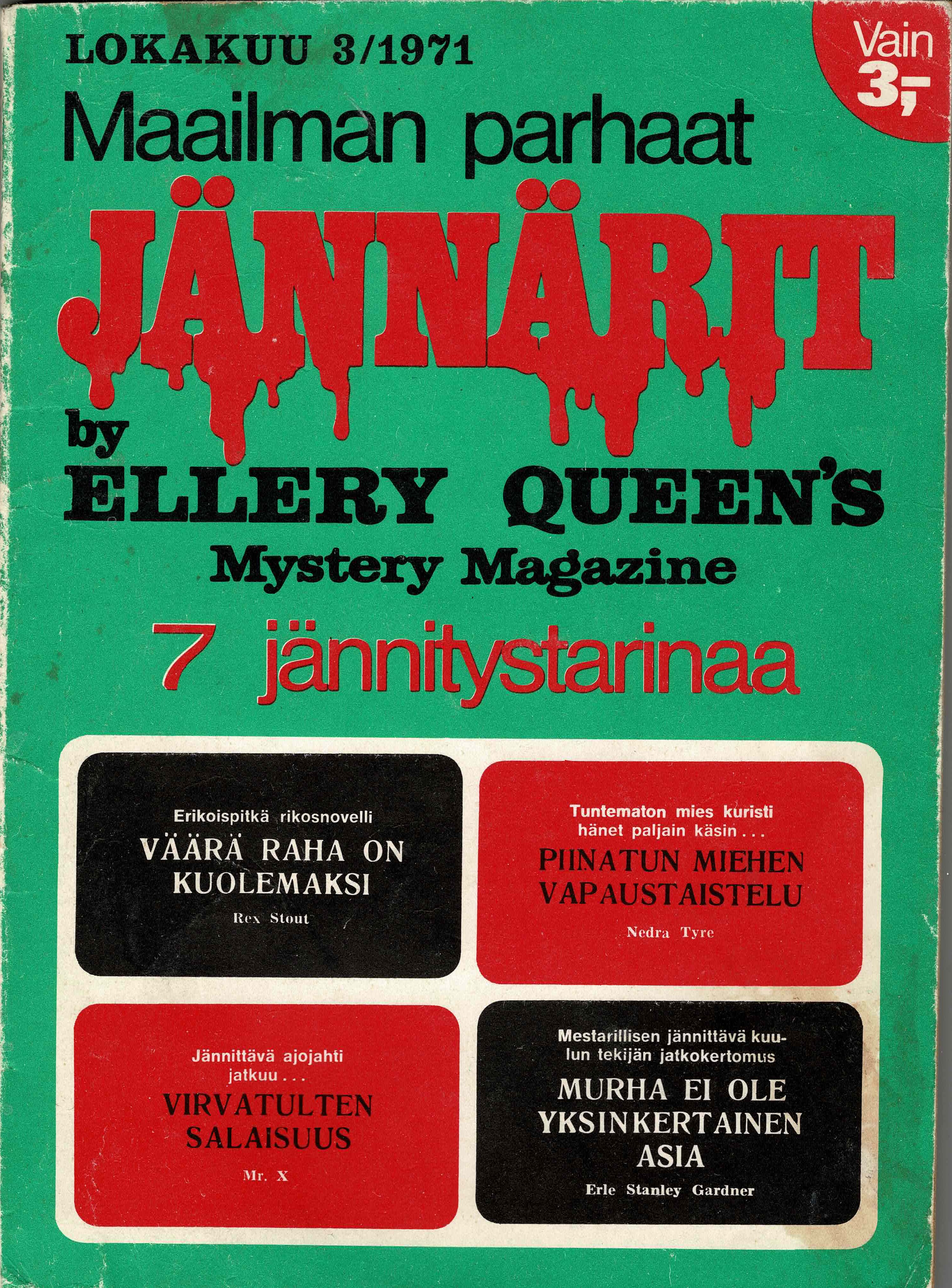 Ira reproduced the story a second time in 2025, when I delivered the keynote address at the Wolfe Pack's Black Orchid banquet, which happens every year on the first Saturday in December. (The Assembly takes place the same afternoon.) As luck would have it, the EQMM website updated the same day as the Assembly and banquet to show the January/February 2026 issue, which included my translation of Finnish author Tapani Bagge's story "The Yellow Dog," and Tapani sent me scans of the covers of several old issues of EQMM containing Finnish translations of my stories, including the one that appears at the left of this page, which included "Caesarin hauta," or "Sam Buried Caesar." If the "3/1971"at the top of the cover means that the issue came out in March 1971, then the Finnish version of my story was actually published five months before the English-language version!