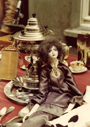 I shot two versions of this picture at an outdoor flea market in Köln (Cologne), West Germany, in the summer of 1976 this one, and a closeup of the doll's face. They're two of my favorite photos I've ever taken, and one of the very few regrets I have in my life is that I didn't buy the doll when I had the chance.