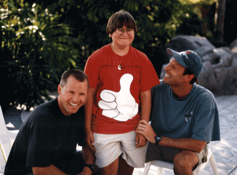 The two guys flanking Becca are her half-brothers, Jeff and Kevin. They are terrific guys, both of them, but their mother doesn't have any contact with them, and Becca knew of their existence but had never met them. She was fascinated by the idea of having brothers, though, and I tracked them down for her and took her out to Los Angeles to meet them around 1997 or '98. They're both married, and each of them has a son and a daughter, so we also got to meet two half-sisters-in-law, two half-nieces and two half-nephews! Everyone got along famously, and we've since been back a couple more times....