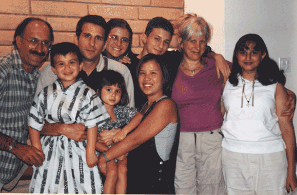 Reading from left to right in the back row: me, my brother Richard, Becca, my nephew Sam, my sister Laura and my niece Alia. Up front, also left to right, are my nephew Jacob, niece Allie and sister-in-law Terry. Richard's an attorney and Terry's a dentist; they live in California. Laura works in the family business (Bras 'n' Things, a lingerie store) and lives with her kids in Florida. This picture was taken in California around 2001, the last time all of us were able to get together.