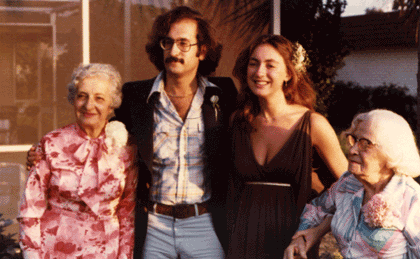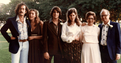 Speaking of family, I also have a pair of parents Martha and Bernie and, although they've both now passed away, I used to have a pair of grandmothers. (My grandfathers both died before I was born.) This next picture was taken in March of 1973, on the occasion of Richard's bar mitzvah. That's Bernie and me standing in the back, and Martha, Laura and Richard in the front. (The suit I'm wearing is, I will note, the last suit I ever owned. Of the hair, deponant sayeth not.)