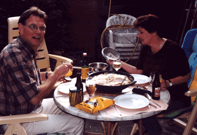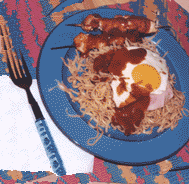 bami goreng The joke in Holland is that, if you want a really authentic meal, you go to a Chinese restaurant and eat off the Indonesian menu. My favorite Chinese-Indonesian meal is bami goreng. Bami is a thick noodle, and goreng refers to the way it's seasoned. It's served with a thin slice of ham on top, a fried egg on top of that, a generous dollop of pindasaus (peanut sauce) and if it's bami goreng speciaal a variety of side dishes. Beer to drink. Hartstikke lekker, zeg! Eet smakelijk! That's my dear Dutch friends Albert Boonstra and Janny Kraak in the photo. When I met them in Canada in 1975, they were married. They eventually divorced but remained friends for a while, and Albert made bami and invited Janny to join us when I visited him in Almere, Holland, during the summer of 2000. If you want to try to make your own bami, you'll have to find mie noodles and seasoning and peanut sauce, and the results ought to turn out looking something like the picture