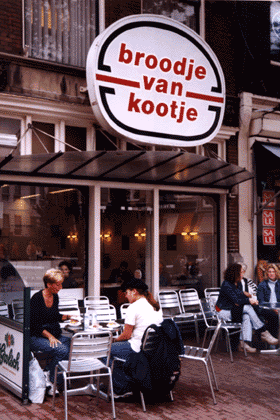 Okay, that established, Broodje van Kootje is a chain of sandwich shops in Amsterdam. The one in the picture is on the Spui forget it, this one you will never pronounce correctly! right around the corner from the Begijnhof. The photo was taken on August 13, 2001, and that's Lynne at the far left and Becca on the other side of the table.