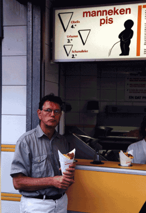 Oh, I almost forgot: that's Albert Boonstra in the picture, which was taken during the summer of 2000, while Becca was at her pre-Choate summer orientation and I visited Europe for the first time since moving back to the US in 1991. "Manneke Pis" is a Belgian-style frites stand on Amsterdam's main shopping street, the Damrak. And, yes, the name means "the Pissing Little Guy." There's a big statue of the Manneke Pis in the heart of downtown Brussells which goes a long way towards explaining why the Dutch equivalent of the Polish joke is the Belgian joke. (Did you hear about the Belgian terrorist who tried to blow up a bus? He burned his lips on the exhaust pipe. Or here's an appropriate one we don't have in the US: What does a Belgian call his parents? PAtats and MAyonnaise. Get it?)