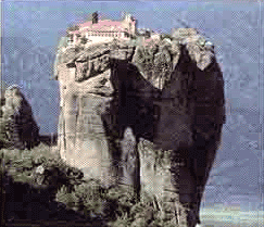 Six hundred or more years ago, monks in this area of northern Greece were being persecuted and killed by bandits. For self-protection, they scaled these monolithic rock outcroppings and, using simple pulleys, hoisted up building materials from the valley floor far below and actually built themselves a series of monasteries to live in. If memory serves, there were 28 of them in all, but only three of them remain intact today and two of those can be visited by tourists: one by climbing the stone steps carved into the rock during the 1930s and the other by walking across a narrow wooden bridge thrown up around the same time.
